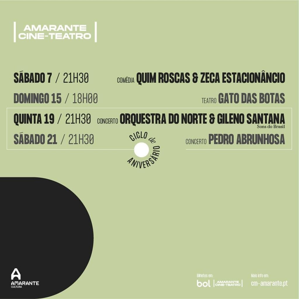 Setembro é o mês em que se assinala o primeiro aniversário do Amarante Cine-Teatro [A_CT] e a programação é bastante diversificada. Todos estão convidados para mais um mês repleto com música, comédia e teatro. 𝐎𝐬 𝐛𝐢𝐥𝐡𝐞𝐭𝐞𝐬 𝐩𝐨𝐝𝐞𝐦 𝐬𝐞𝐫 𝐚𝐝𝐪𝐮𝐢𝐫𝐢𝐝𝐨𝐬 𝐧𝐚 𝐛𝐢𝐥𝐡𝐞𝐭𝐞𝐢𝐫𝐚 𝐝𝐨 𝐀_𝐂𝐓 𝐨𝐮 𝐞𝐦 𝐜𝐢𝐧𝐞𝐭𝐞𝐚𝐭𝐫𝐨𝐚𝐦𝐚𝐫𝐚𝐧𝐭𝐞.𝐛𝐨𝐥.𝐩𝐭 𝐚 𝐩𝐚𝐫𝐭𝐢𝐫 𝐝𝐚𝐬 𝟏𝟎𝐡𝟎𝟎 𝐝𝐞𝐬𝐭𝐚 𝐬𝐞𝐱𝐭𝐚-𝐟𝐞𝐢𝐫𝐚, 𝟐𝟑 𝐝𝐞 𝐚𝐠𝐨𝐬𝐭𝐨.