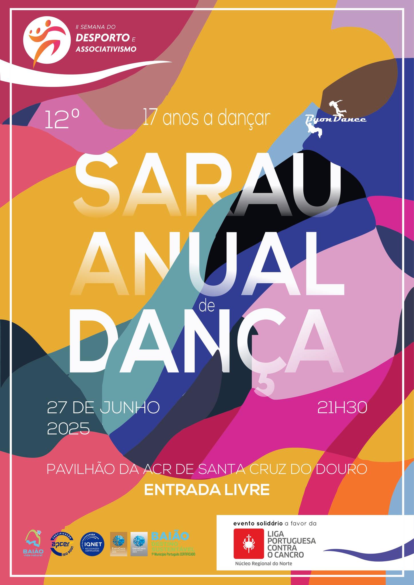 No âmbito da II Semana do Desporto e Associativismo da Câmara Municipal de Baião, terá lugar o 12.º Sarau Anual de Dança, a 27 de junho, pelas 21h30, no Pavilhão da Associação Cultural e Recreativa de Santa Cruz do Douro.