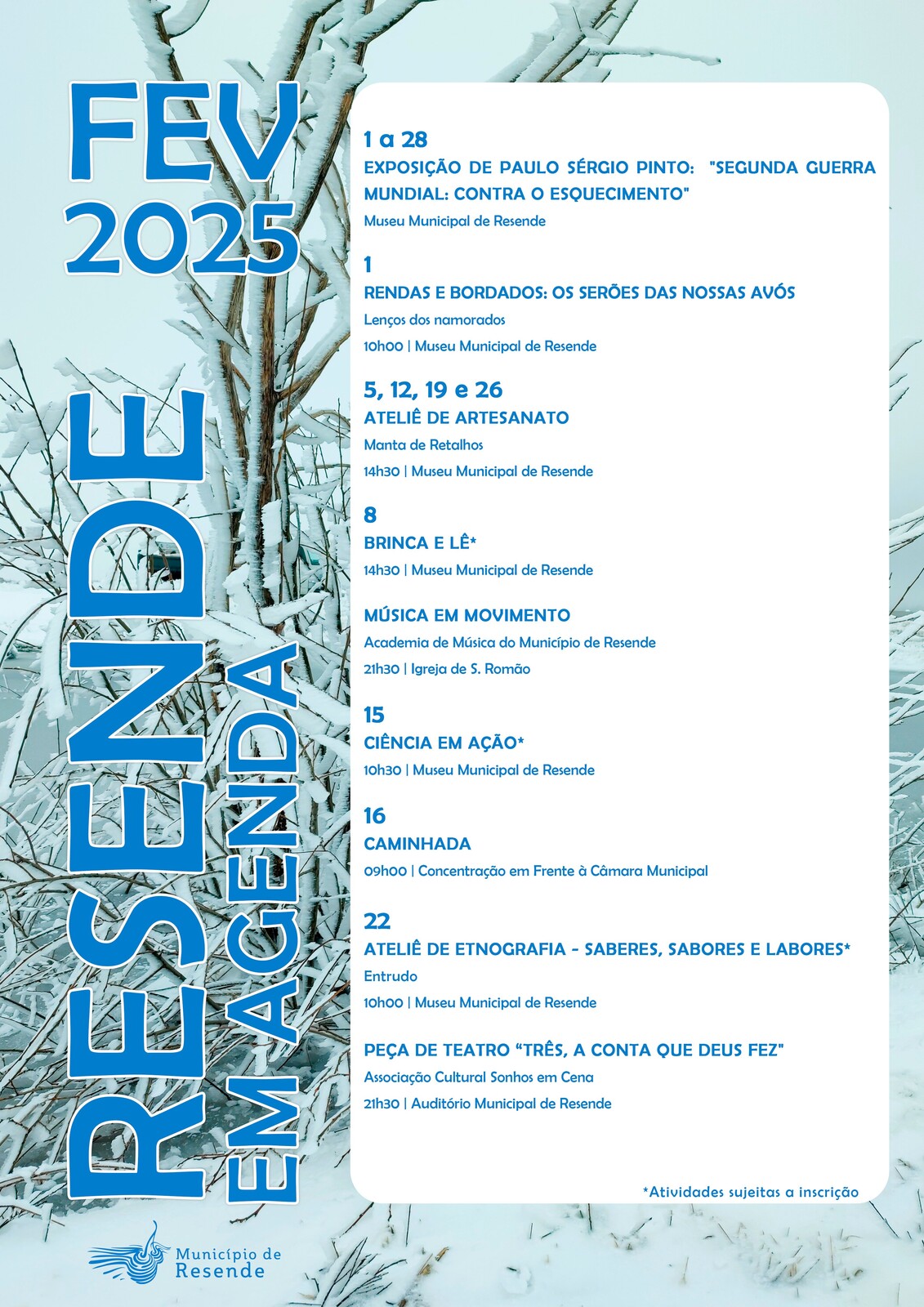 O Município de Resende convida toda a comunidade a participar na agenda de eventos prevista para o mês de fevereiro, com uma programação diversificada que celebra a cultura, música e tradição.