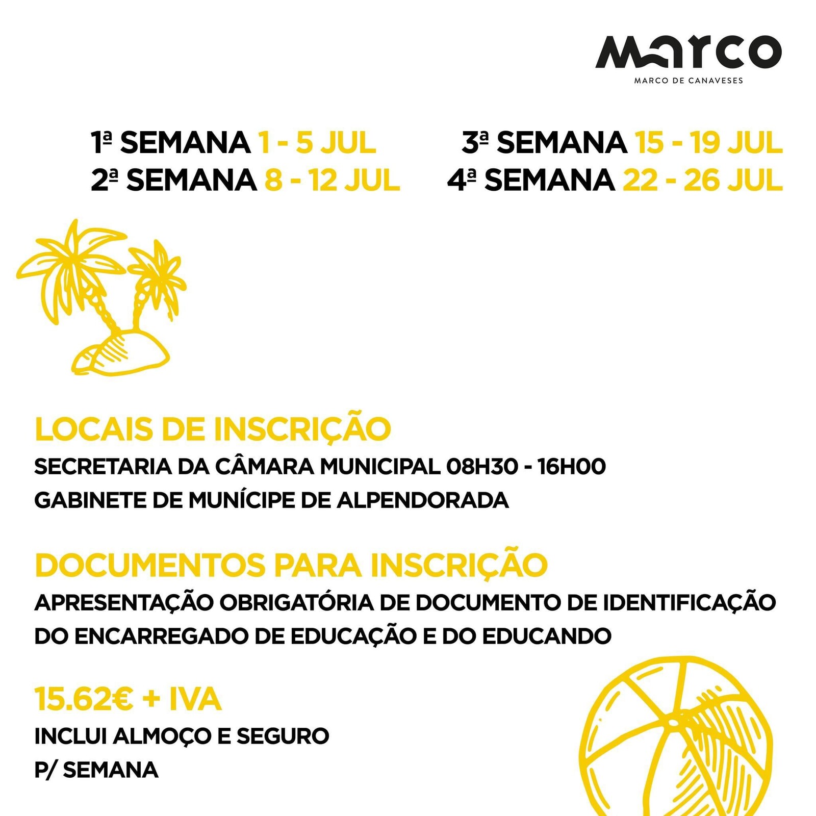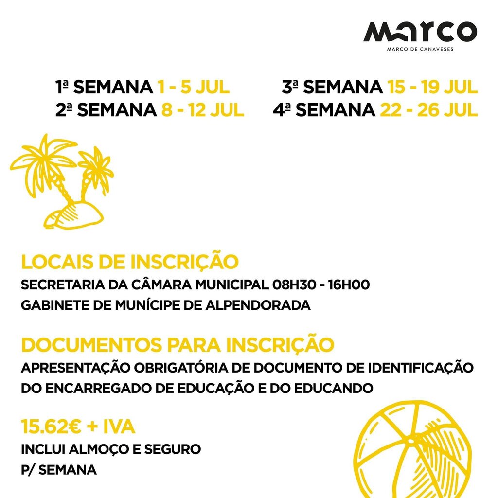 As inscrições do Clube de Férias de Verão são limitadas às vagas existentes e podem ser feitas na Secretaria da Câmara Municipal (08h30 às 16h00) e no Gabinete do Munícipe de Alpendorada, pelo preço de 15,62€ + IVA por semana, com almoço e seguro incluídos.