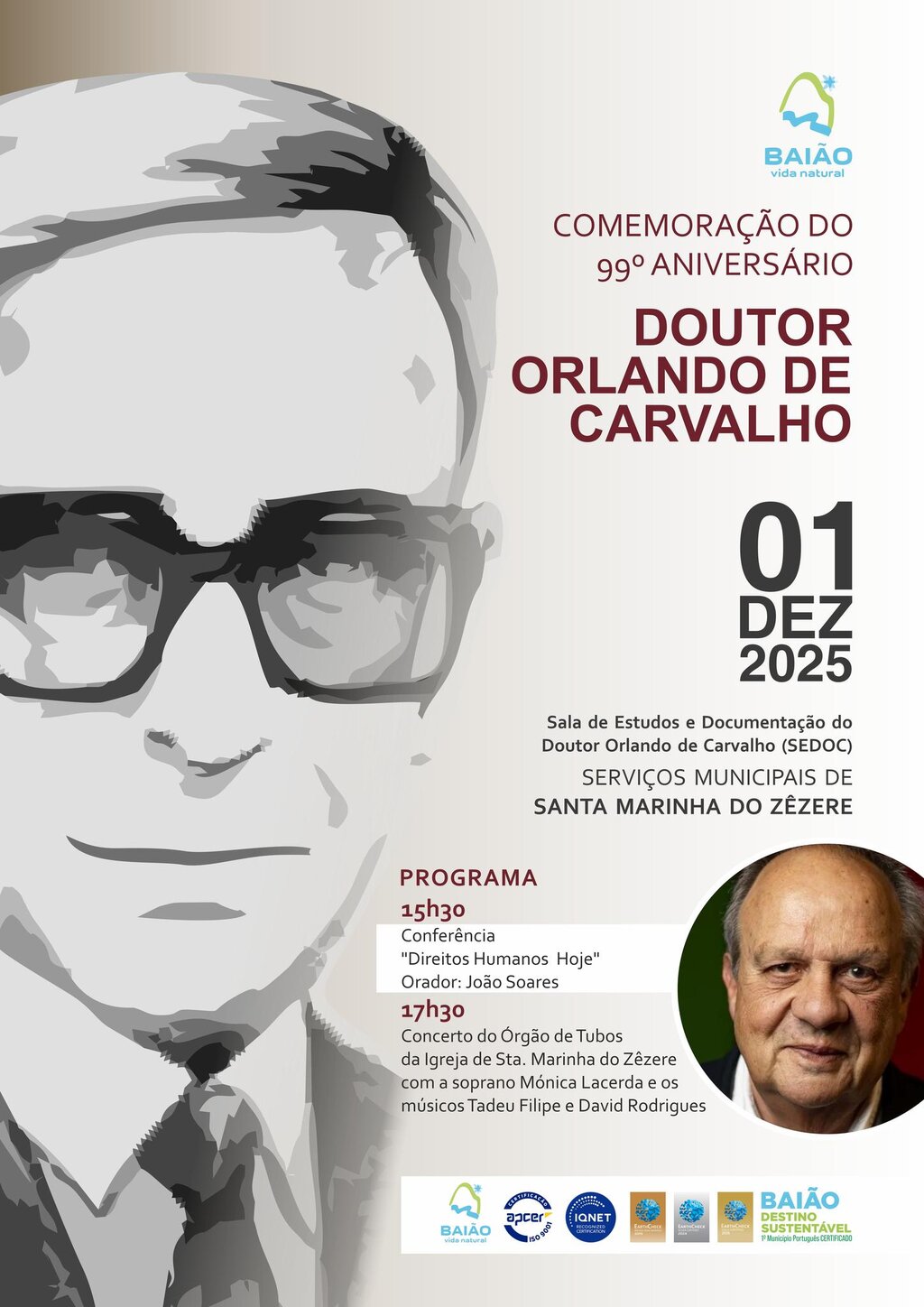 No próximo dia 1 de Dezembro, pelas 15h30m, os Serviços Descentralizados do Município de Baião, em Santa Marinha do Zêzere, recebem as comemorações do 99.º aniversário do nascimento do Doutor Orlando de Carvalho.