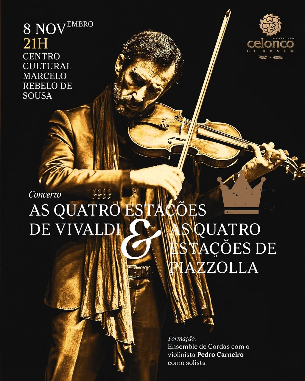 As quatro estações de Vivaldy & As quatro estações de Piazzolla juntas num único e extraordinário concerto, no dia 8 de novembro, pelas 21 horas, no Centro Cultural de Marcelo Rebelo de Sousa, em Celorico de Basto. Um momento protagonizado pelo Ensemble de Cordas e o vionilista, Pedro Carneiro.