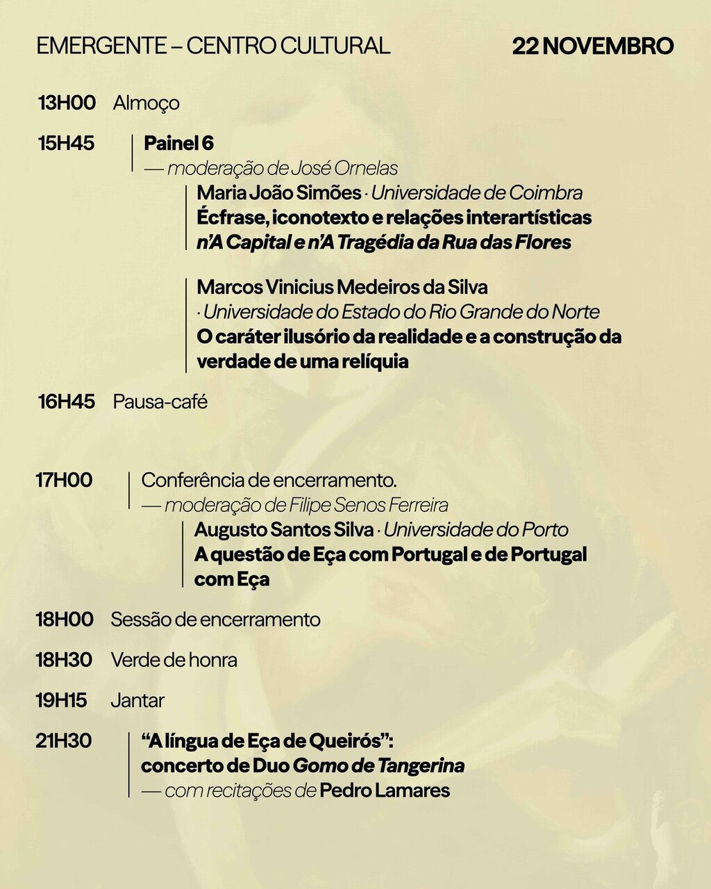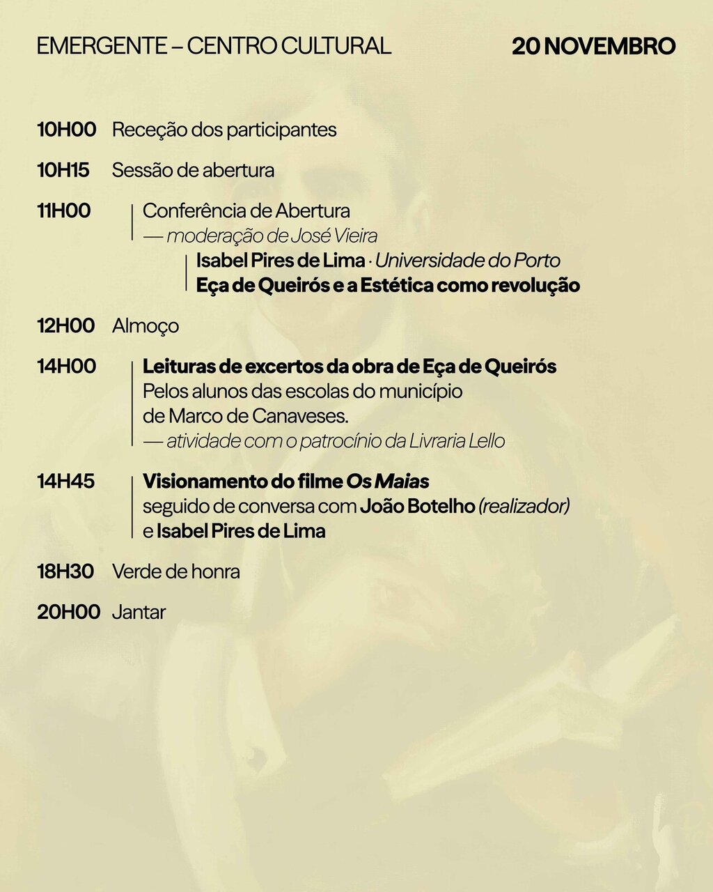 O programa inclui conferências, tertúlias, cinema, leituras e momentos artísticos inspirados em Eça de Queirós — um evento aberto à comunidade, às escolas e a todos os amantes da literatura.