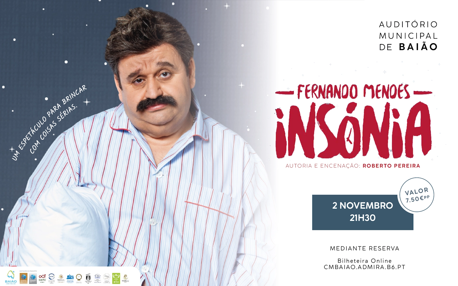 “Insónia”, com Fernando Mendes no Auditório Municipal de Baião! O personagem é Custódio Reis, um vendedor de vinhos em crise financeira e familiar, que procura ter paz de alma através de momentos hilariantes com amigos, enquanto lida com as suas dívidas e a pressão da vida no geral.