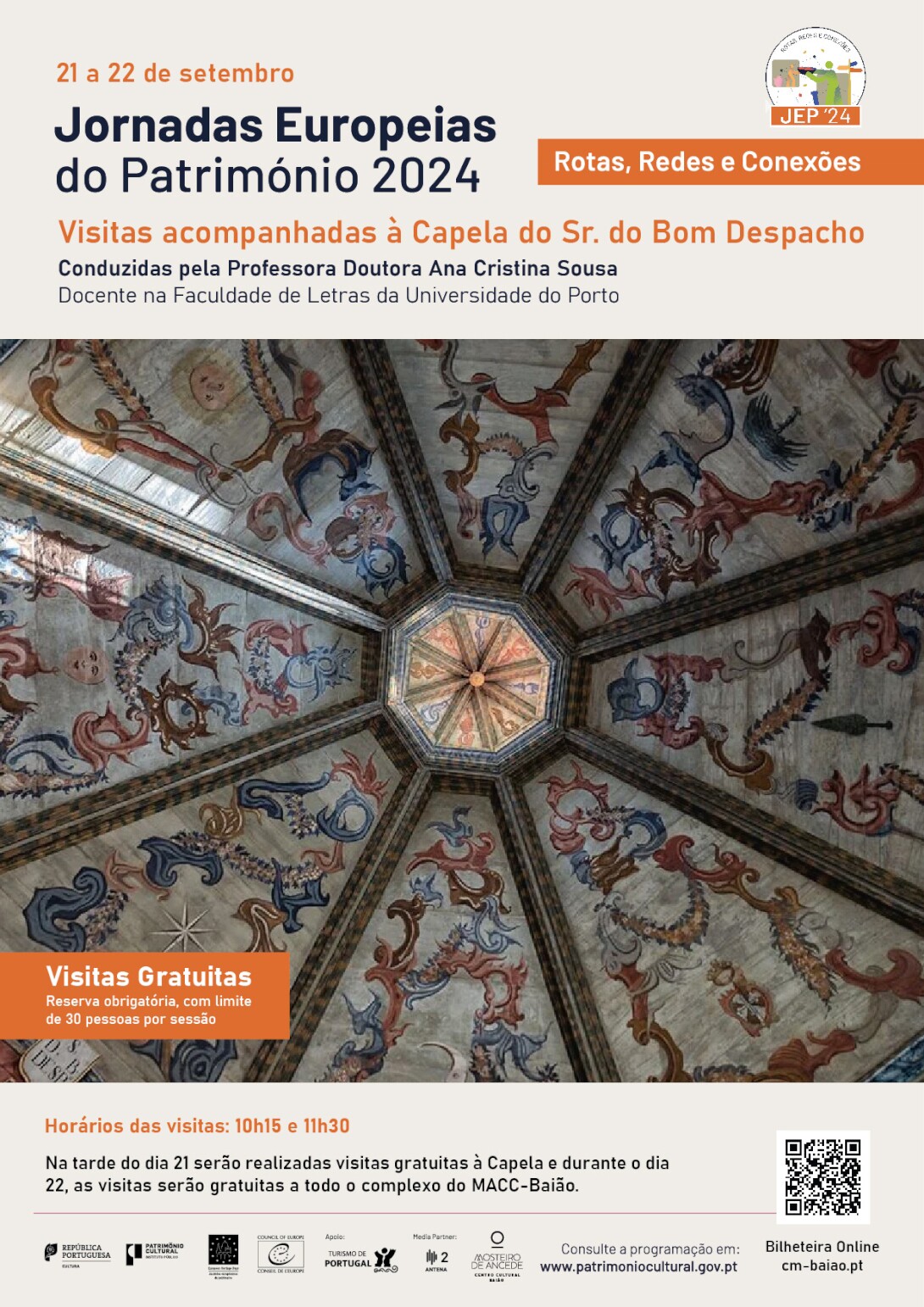 A temática para 2024 intitula-se “Rotas, Redes e Conexões” e, no dia 21 de setembro, terá lugar na Capela do Senhor do Bom Despacho uma conversa centrada no património barroco deste espaço emblemático, com Ana Cristina Sousa, docente da Faculdade de Letras da Universidade do Porto.