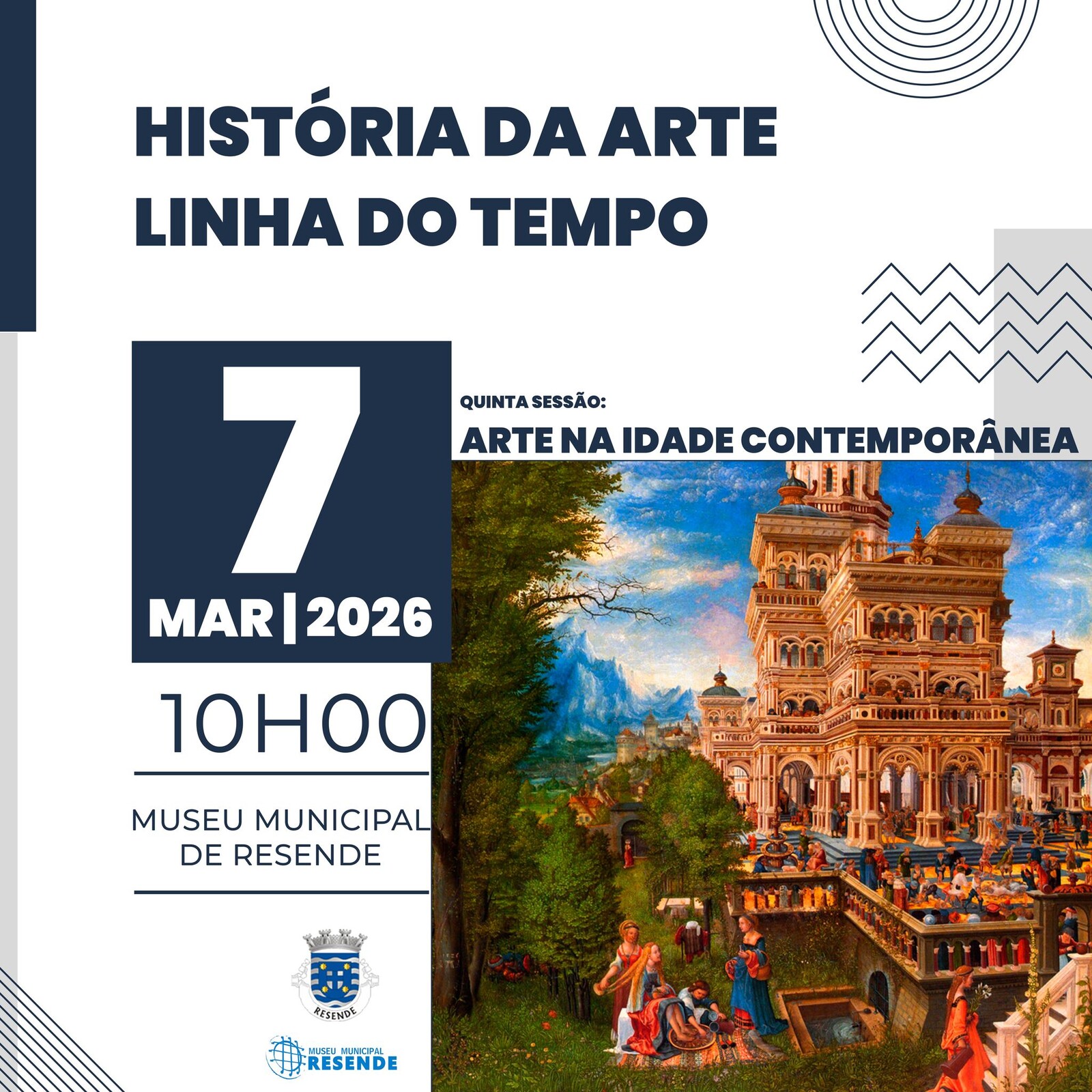 No próximo sábado, dia 7 de março, o Museu Municipal de Resende promove mais uma sessão da 𝐋𝐢𝐧𝐡𝐚 𝐝𝐨 𝐓𝐞𝐦𝐩𝐨 – 𝐇𝐢𝐬𝐭ó𝐫𝐢𝐚 𝐝𝐚 𝐀𝐫𝐭𝐞, desta vez dedicada à Arte na Idade Contemporânea.