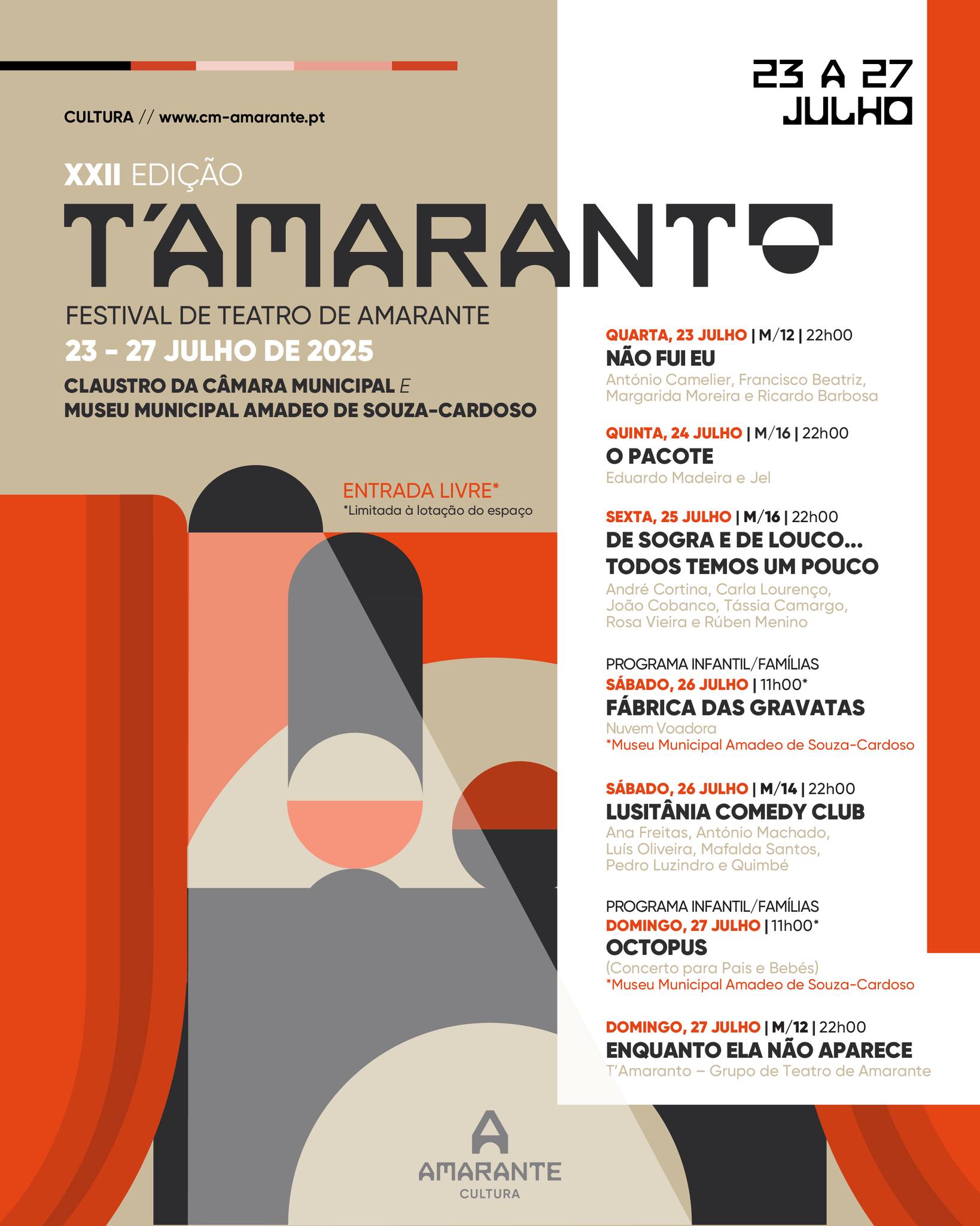 De 23 a 27 de julho, o T’Amaranto - Festival de Teatro de Amarante, está de volta para a 22.ª edição, com cinco noites dedicadas ao teatro!
