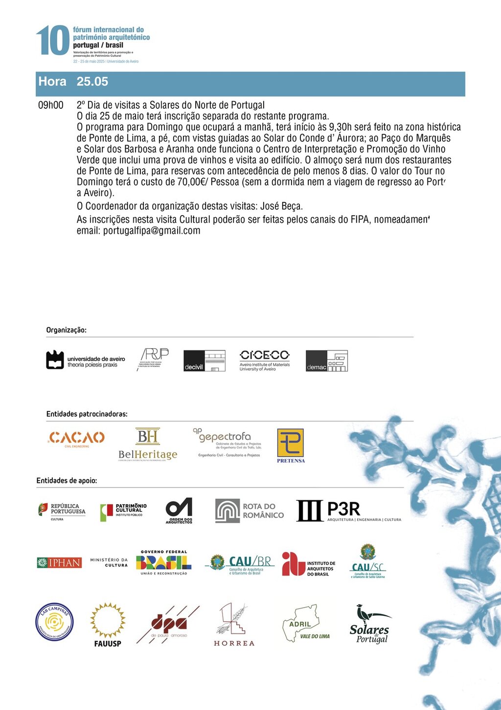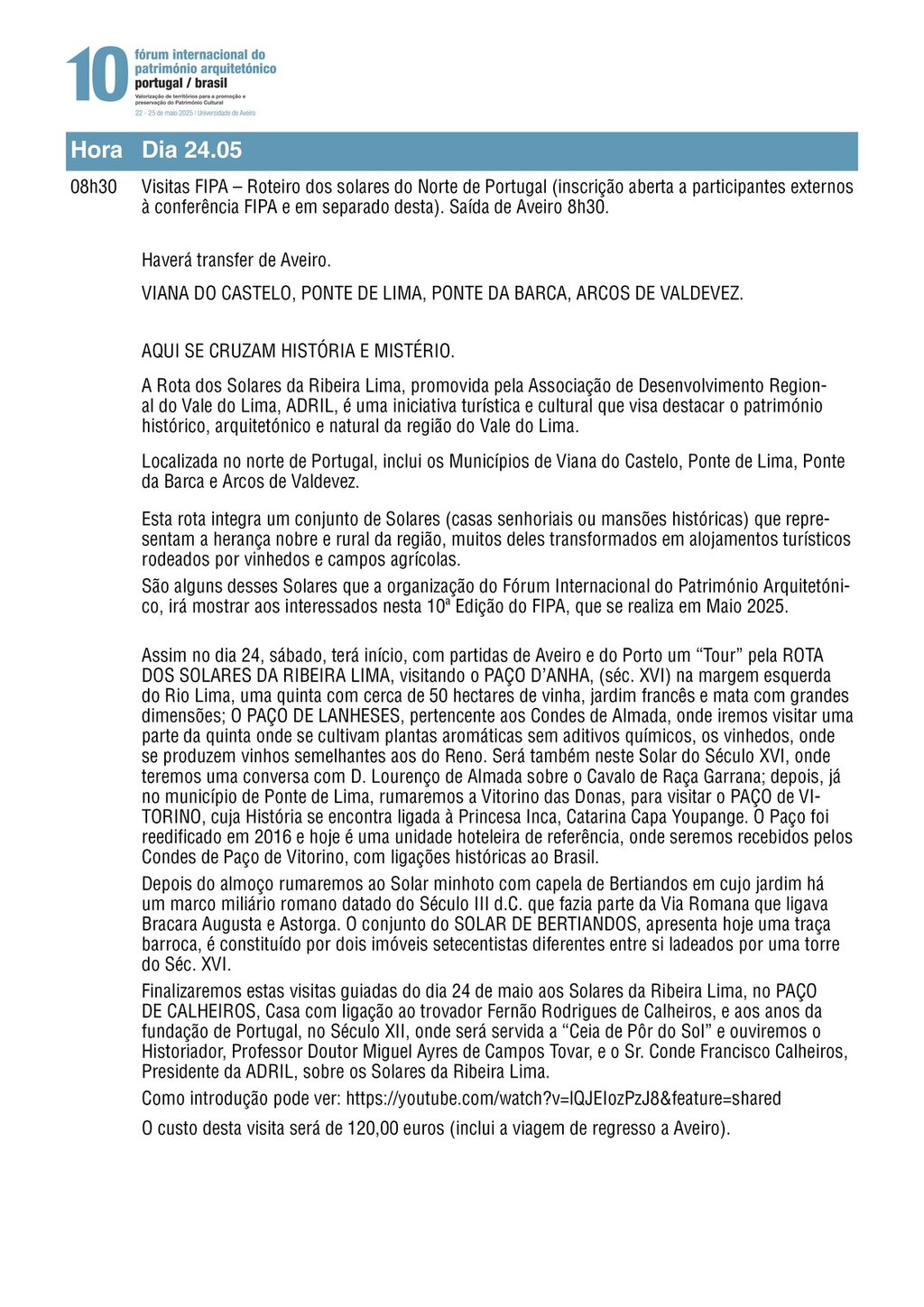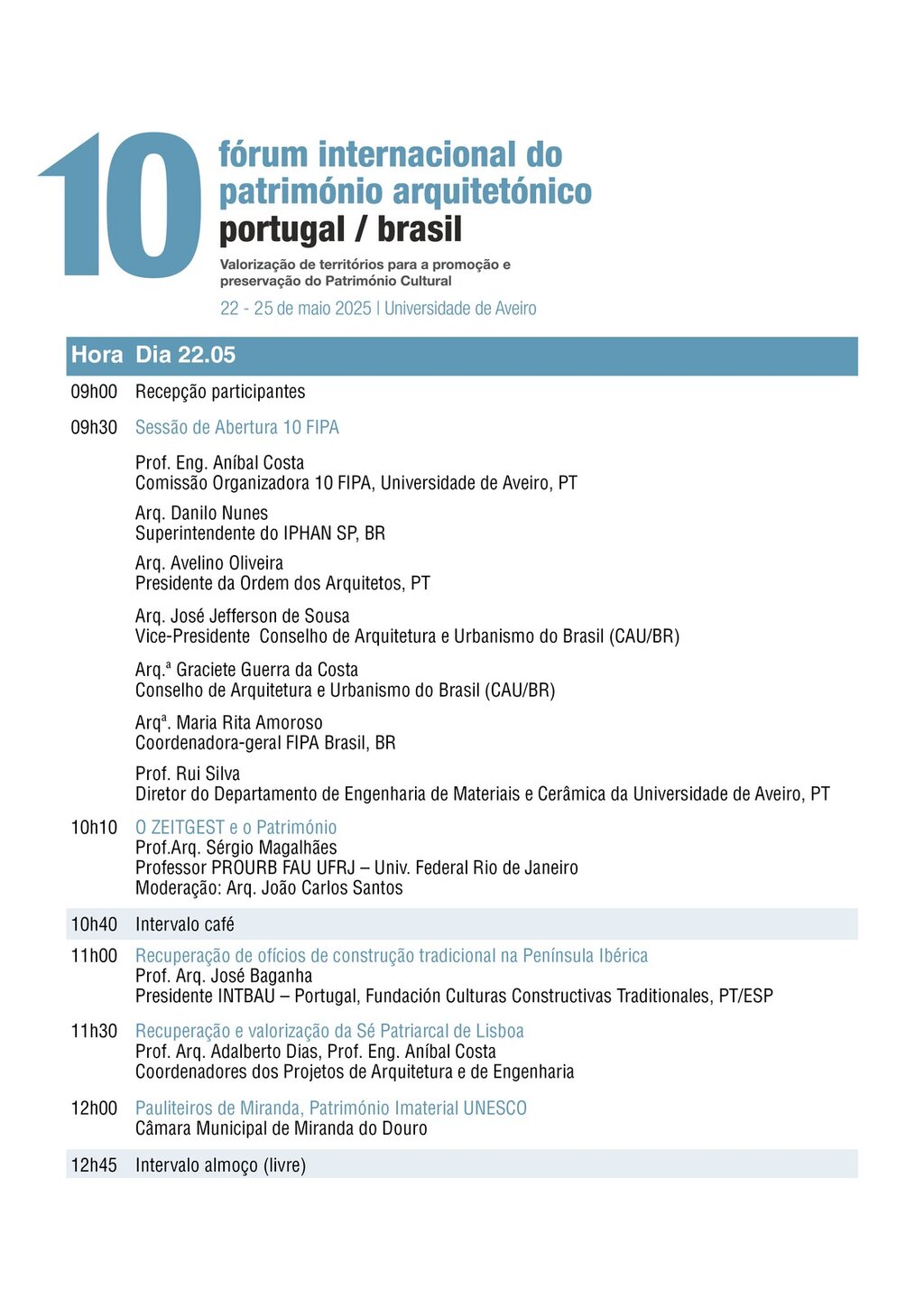 A 10.ª edição do Fórum Internacional do Património Arquitetónico Portugal/Brasil (FIPA) arranca esta quinta-feira, dia 22 de maio, na Universidade de Aveiro, e destaca a importância de uma abordagem integrada ao Património Cultural, considerando a sua ligação ao território, às comunidades e às dinâmicas de transformação social, ambiental e económica. O evento promove uma visão holística e interdisciplinar, conciliando a gestão territorial com a proteção do património construído, natural e agrícola.
