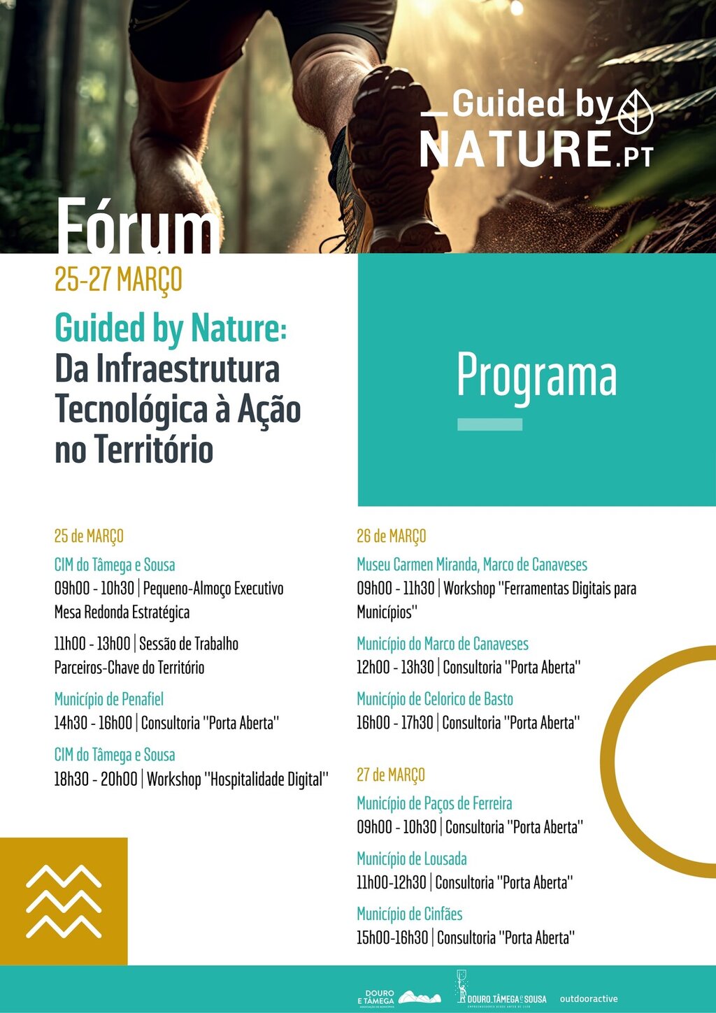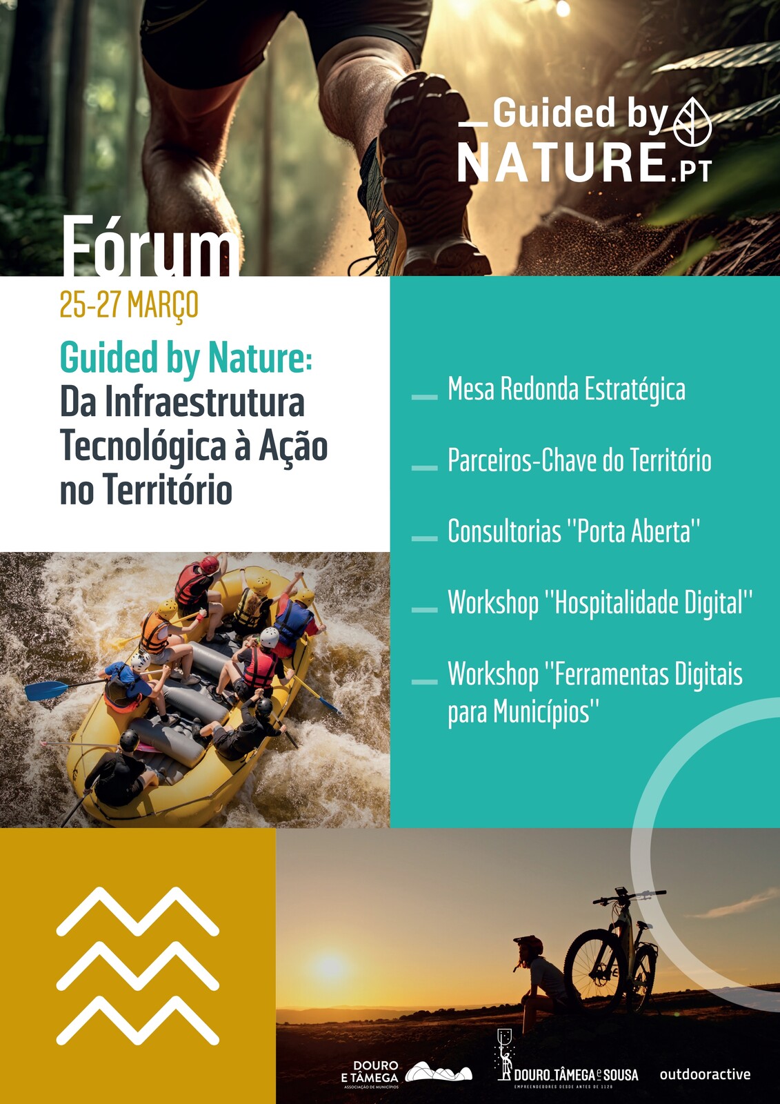 A Associação de Municípios do Douro e Tâmega, com o apoio da CIM do Tâmega e Sousa, promove, entre os dias 25 e 27 de março, o Fórum Guided by Nature: Da Infraestrutura Tecnológica à Ação no Território, iniciativa que assinala uma nova fase estratégica do projeto Guided by Nature. Esta etapa visa consolidar a plataforma como uma infraestrutura digital estruturante da oferta turística da região do Douro, Tâmega e Sousa.